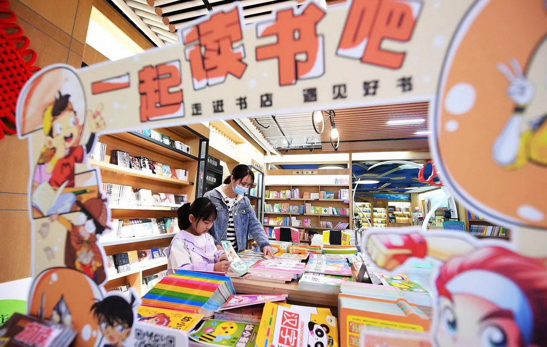 Photo taken on April 16, 2023 shows a woman and her daughter at the Dingzhou Public Library in Dingzhou city, north China's Hebei Province. (People's Daily Online/Zhou Bo)