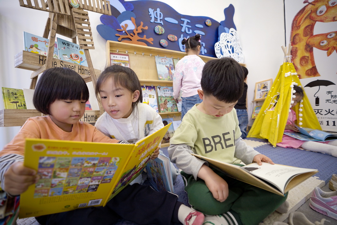 Children read books at a kindergarten in Xiong'an New Area, north China's Hebei Province, April 18, 2023. (People's Daily Online/Yang Hualong)