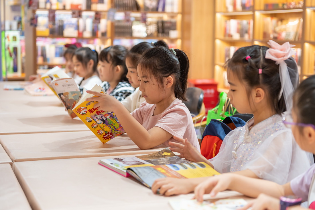 Children of a primary school read books at a book store in Nanning, capital of south China's Guangxi Zhuang Autonomous Region, April 15, 2023. (People's Daily Online/Yan Lizheng)