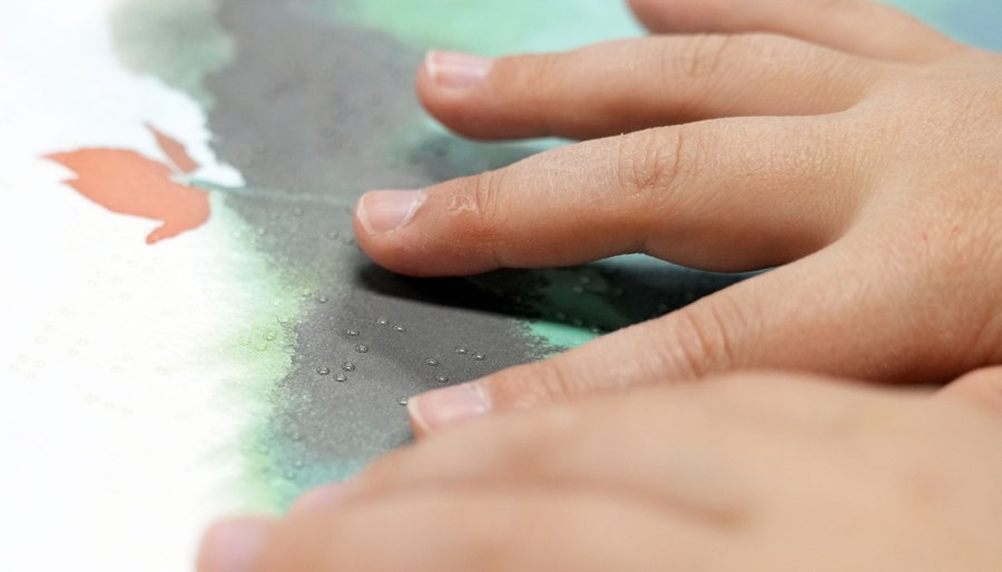A visually impaired child reads a braille book at the China Braille Library in Beijing, capital of China, April 20, 2023. (Xinhua/Cai Yang)