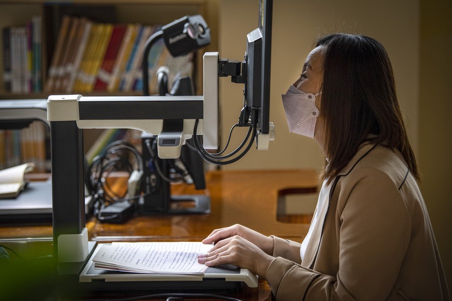 Wang Yufeng, visually impaired, reads with the help of a machine at a rehabilitation center in northwest China's Ningxia Hui Autonomous Region, April 22, 2022. (Xinhua/Feng Kaihua)