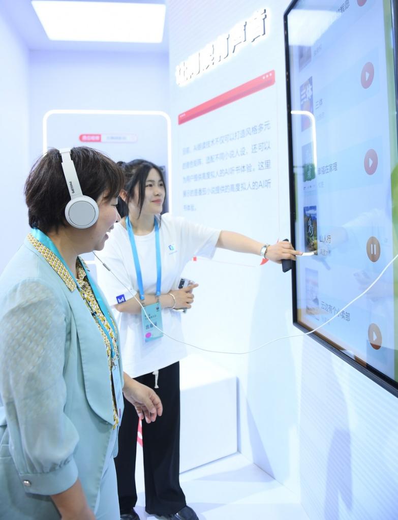 A visitor experiences AI book reading in east China's Zhejiang Province, April 23, 2023. (Xinhua/Weng Xinyang)