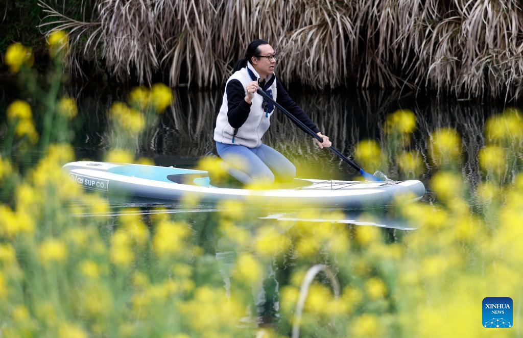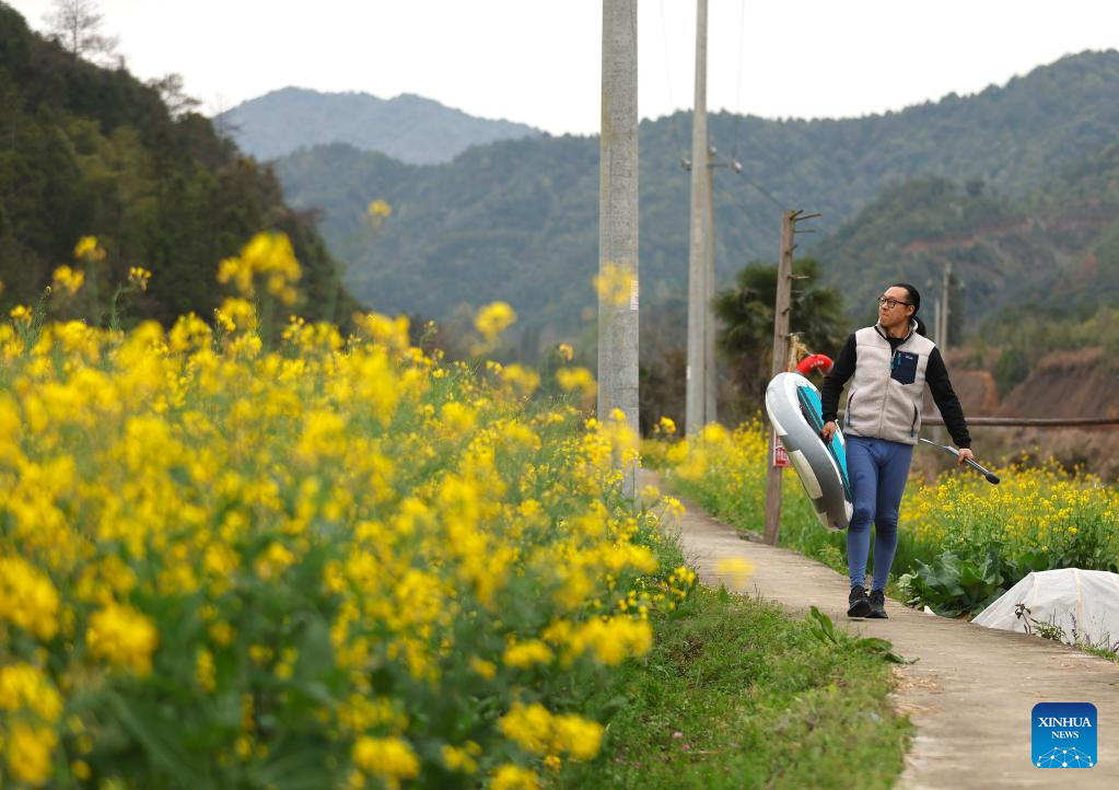 Liu Long carries a paddle board and walks past rapeseed flowers in Wuyuan County of east China's Jiangxi Province, March 29, 2023. (Xinhua/Zhang Chen)