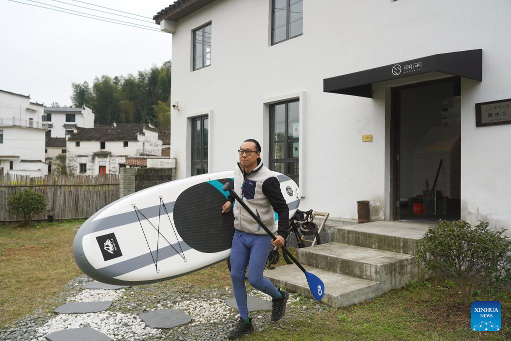 Liu Long carries a paddle board and leaves his guesthouse in Wuyuan County of east China's Jiangxi Province, March 29, 2023. (Xinhua/Wan Xiang)