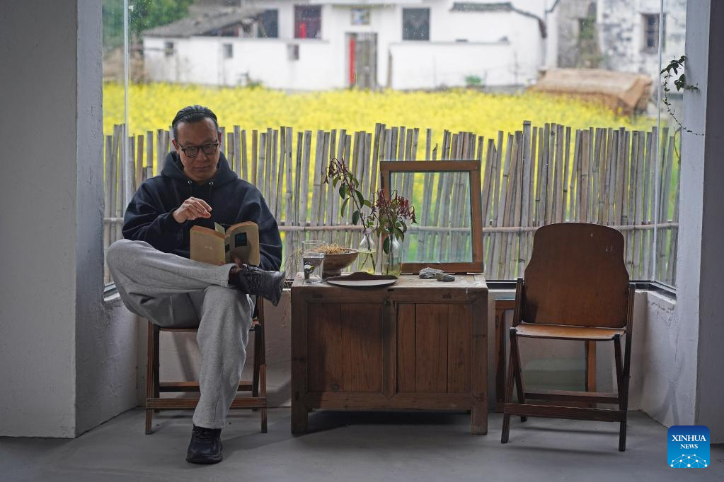Liu Long reads in his guesthouse in Wuyuan County of east China's Jiangxi Province, March 29, 2023. (Xinhua/Wan Xiang)