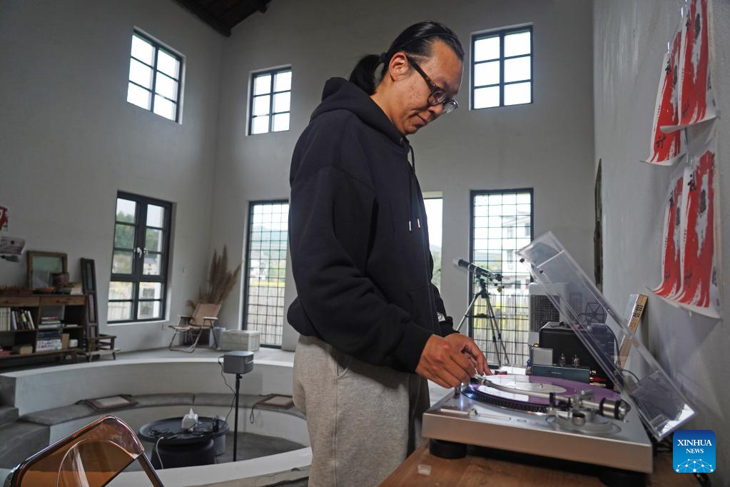 Liu Long plays music in his guesthouse in Wuyuan County of east China's Jiangxi Province, March 29, 2023. (Xinhua/Wan Xiang)