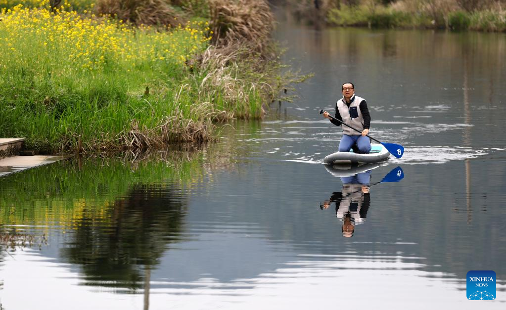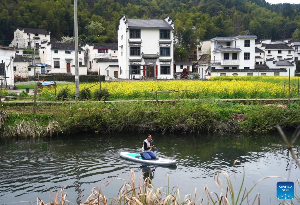 Liu Long goes paddle boarding in Wuyuan County of east China's Jiangxi Province, March 29, 2023. (Xinhua/Wan Xiang)