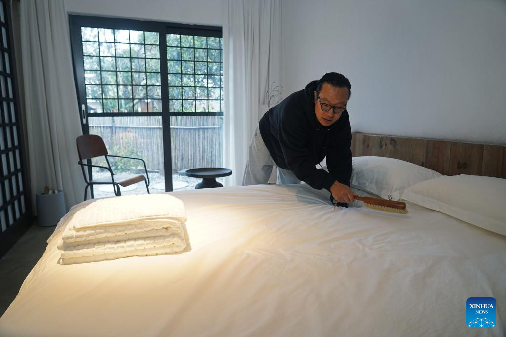 Liu Long organizes the room in his homestay in Wuyuan County of east China's Jiangxi Province, March 29, 2023. (Xinhua/Wan Xiang)