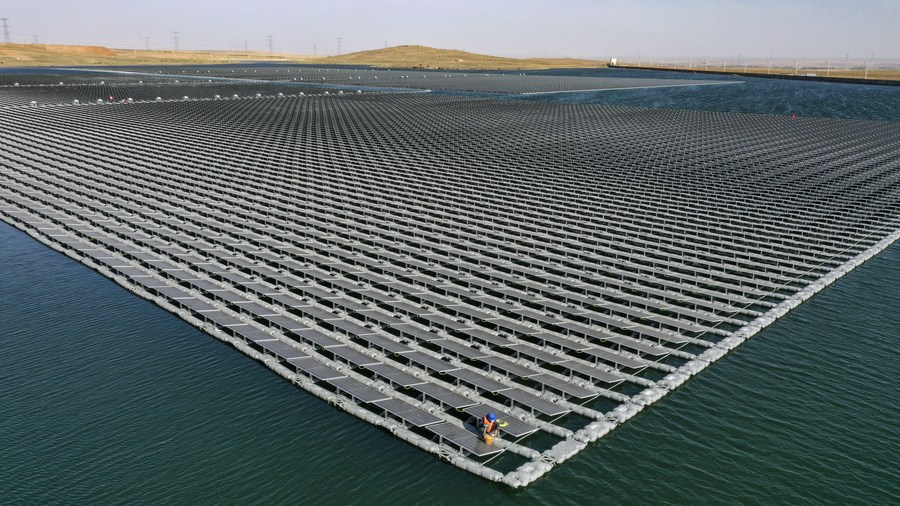 This aerial photo taken on June 17, 2022 shows a view of floating photovoltaic power station in Lingwu, northwest China's Ningxia Hui Autonomous Region. (Xinhua/Wang Peng)