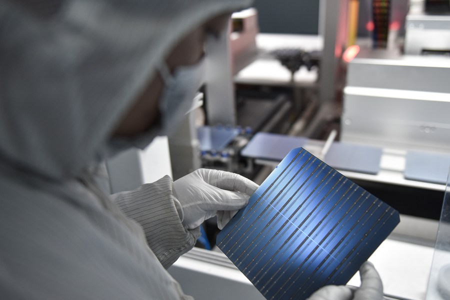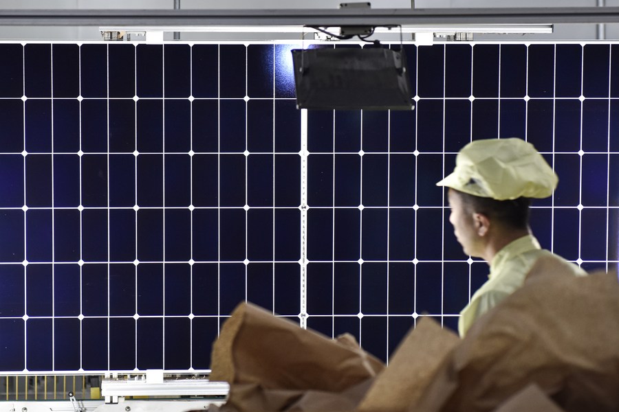 A worker works at a workshop of a photovoltaic modules manufacturer in Xining, northwest China's Qinghai Province, Feb. 22, 2023. (Xinhua/Wu Gang)