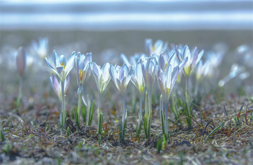 The flowers of Crocus alatavicus, with yellow stamens and petals that are purple on the outside and white inside, sway in the spring breeze in the Nalati grasslands in the Ili Kazak Autonomous Prefecture, northwest China's Xinjiang Uygur Autonomous Region. (Photo/Yang Xiaoqian)