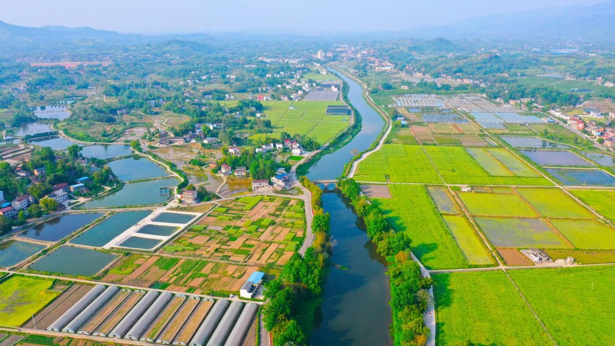 Photo taken on April 19, 2023 shows a beautiful rural scene consisting of the Longxi River and surrounding rural residence, fish ponds, greenhouses and rapeseed flower fields in southwest China's Chongqing municipality. (People's Daily Online/Liu Hui)
