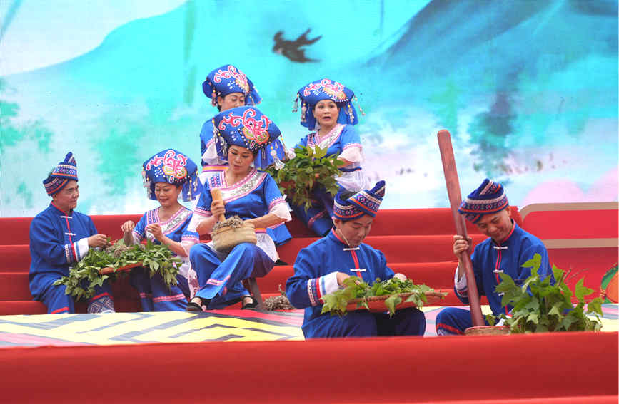 Photo shows a presentation on how to make five-color glutinous rice, a delicacy in south China's Guangxi Zhuang Autonomous Region. (Photo/Ma Xin)