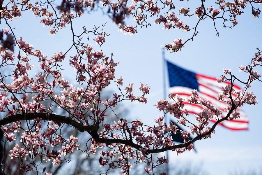 Photo taken on March 16, 2023 shows magnolia tree blooms at the Tidal Basin in Washington, D.C., the United States. (Xinhua/Liu Jie)