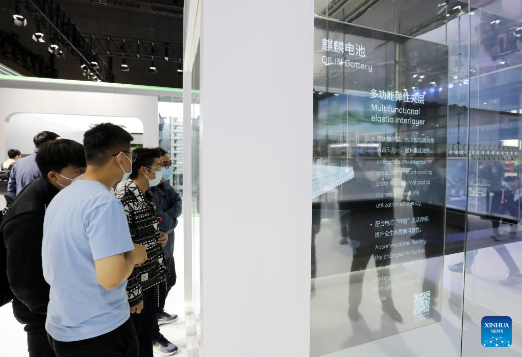 Visitors discuss while looking at a model of Qilin battery from Contemporary Amperex Technology Co., Limited (CATL) at the 20th Shanghai International Automobile Industry Exhibition in east China's Shanghai, April 24, 2023. (Xinhua/Fang Zhe)