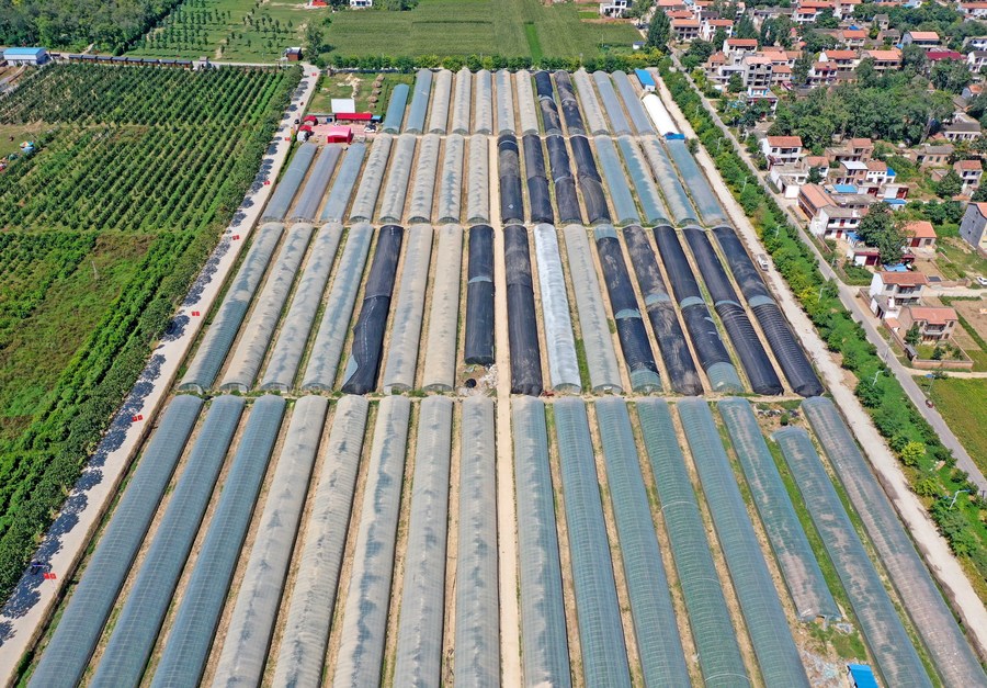 Aerial photo taken on Sept. 3, 2020 shows the view of green houses in Zhangzhuang Village of Lankao County, central China's Henan Province. (Xinhua/Feng Dapeng)