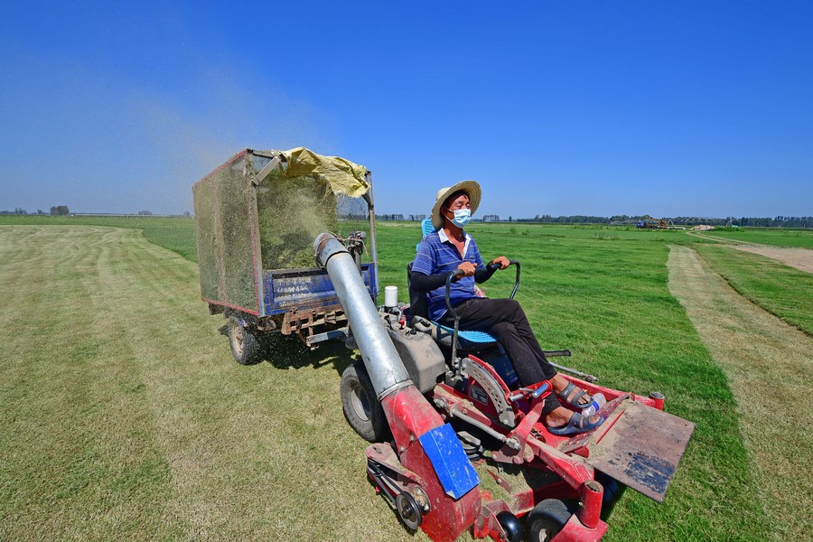 A villager mows the grass in Zhangzhuang Village of Lankao County, central China's Henan Province, Sept. 3, 2020. (Xinhua/Feng Dapeng)