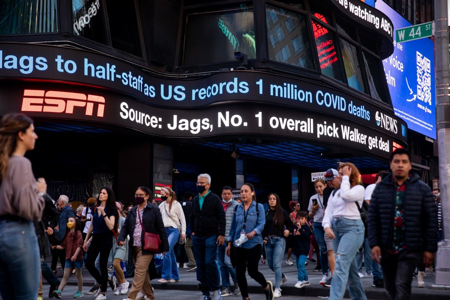 Pedestrians walk in front of a Times Square news ticker in New York, the United States, on May 12, 2022. (Photo by Michael Nagle/Xinhua)