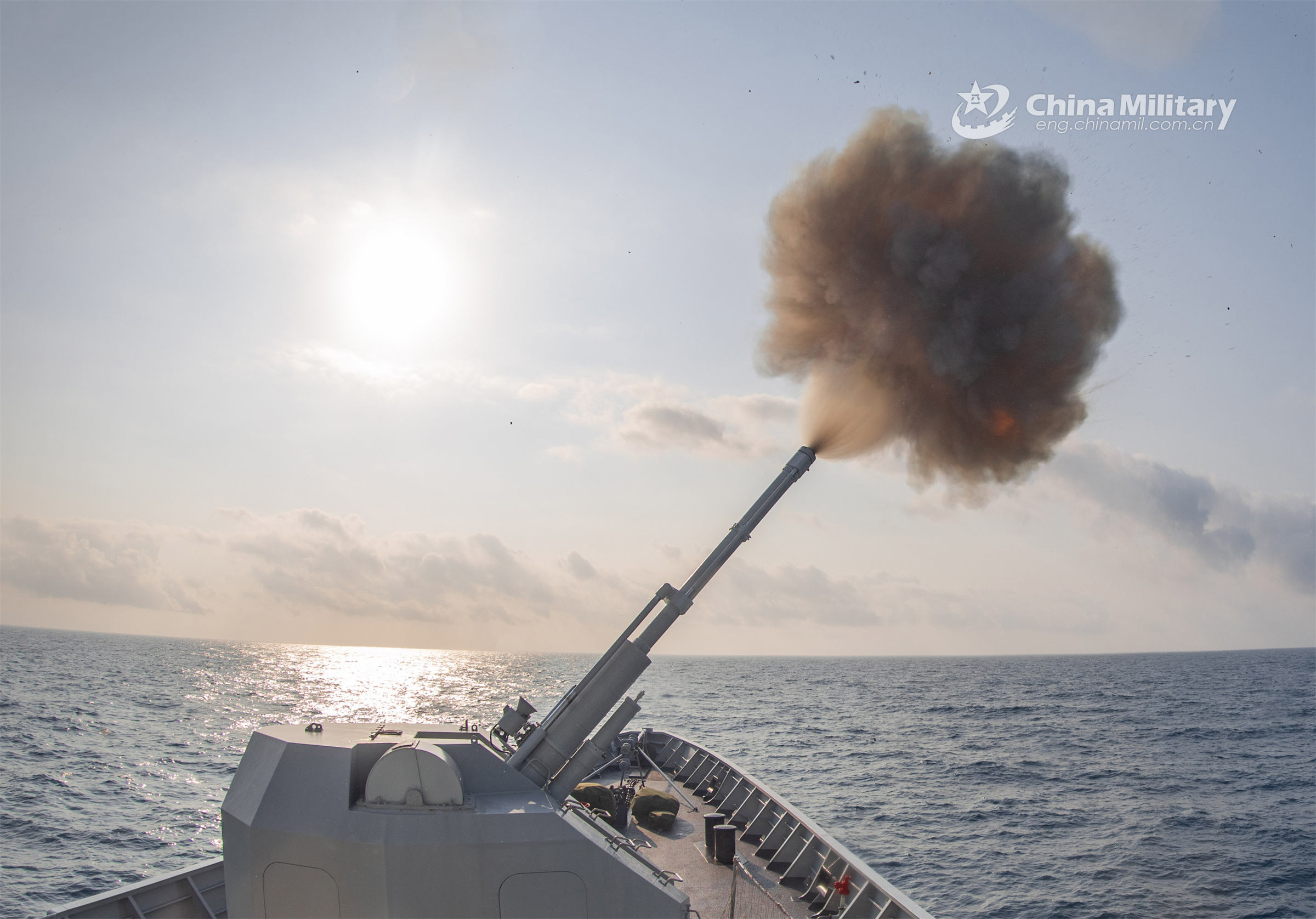 A vessel attached to a naval frigate flotilla under the PLA Southern Theater Command fires its main gun at mock air targets during a real-combat training exercise on March 25, 2023. (eng.chinamil.com.cn/Photo by Zhang Bin)