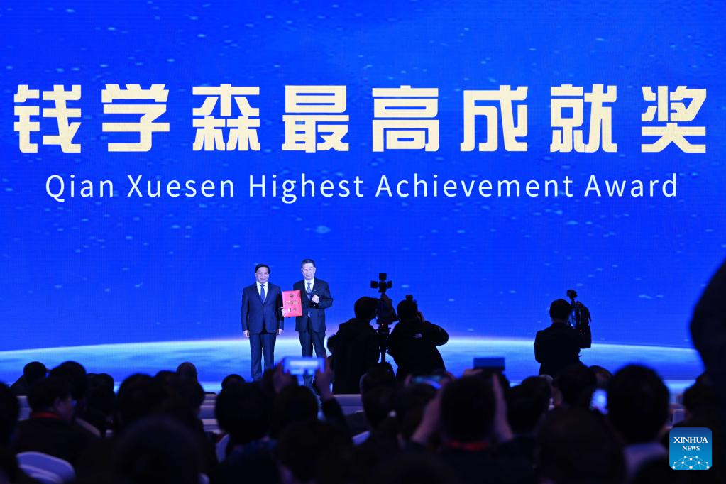 Zhou Jianping, an academician of the Chinese Academy of Engineering and the chief designer of China's manned space program, is awarded the Qian Xuesen Highest Achievement Award in Hefei, east China's Anhui Province, April 24, 2023. (Xinhua/Huang Bohan)