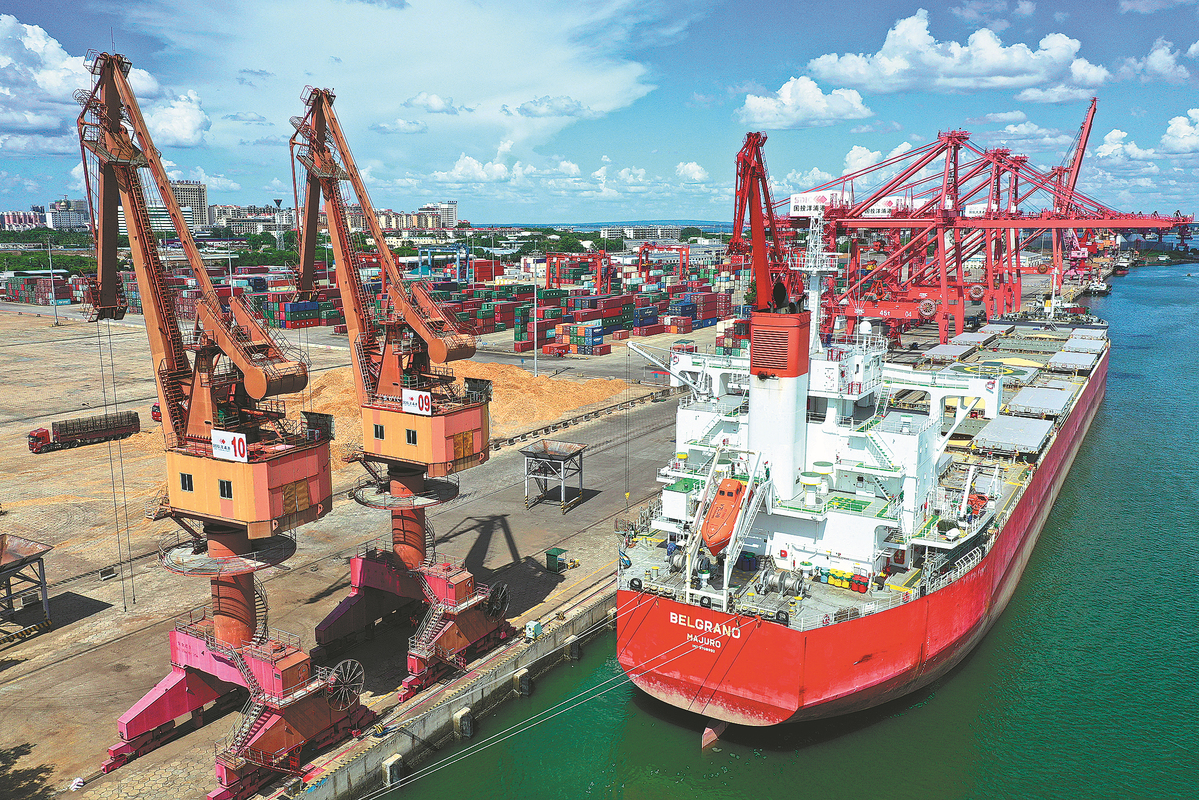 A ship carrying soybeans from Brazil arrives at a port in Haikou, Hainan province, in July. GUO CHENG/XINHUA