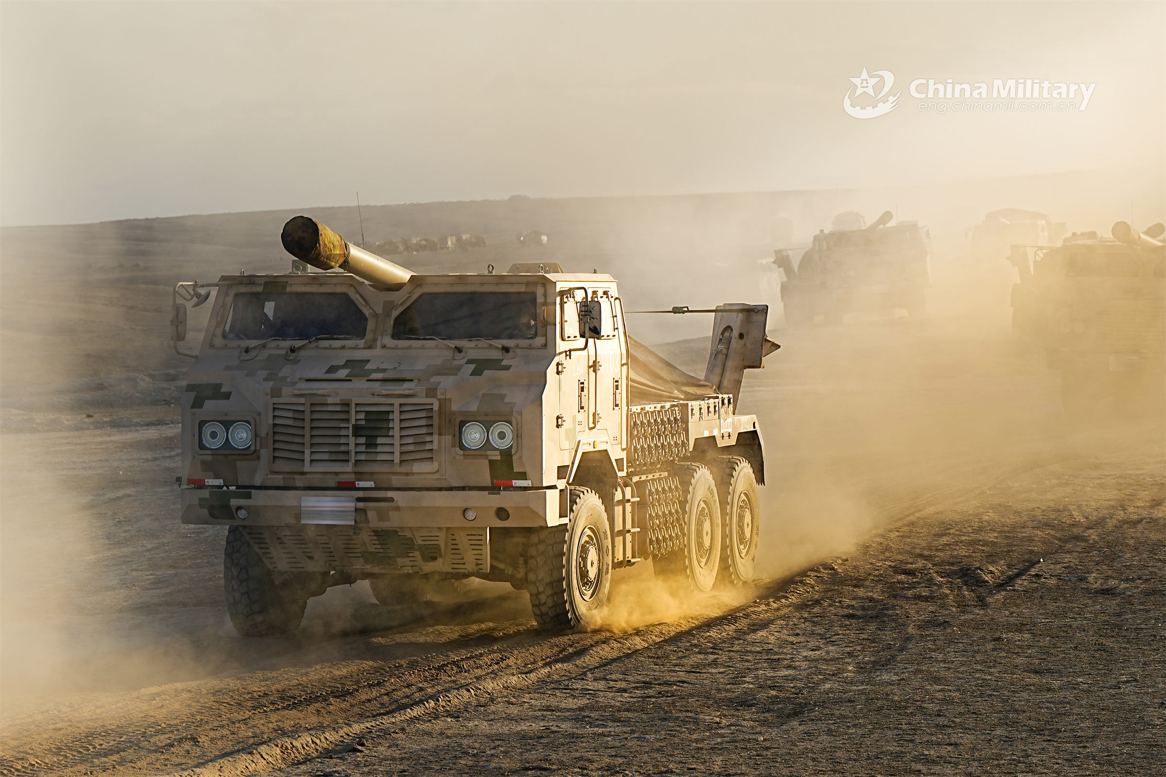 Truck-mounted artillery systems attached to an artillery element with a regiment under the PLA Xinjiang Military Command kick up plumes of dust en route to the designated area during a tactical maneuver training exercise on April 3, 2023. (eng.chinamil.com.cn/Photo by Zhou Yubin)