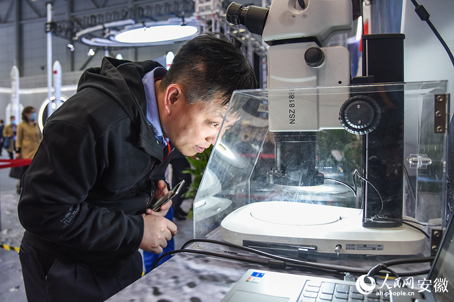 A visitor looks at a sample of lunar soil at a thematic exhibition to mark the eighth Space Day of China held in Hefei city, capital of east China's Anhui Province. (People's Daily Online/Li Ximeng)