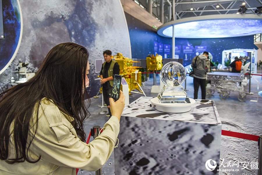 A visitor takes a photo of a lunar soil sample at a thematic exhibition to mark the eighth Space Day of China held in Hefei city, capital of east China's Anhui Province. (People's Daily Online/Li Ximeng)