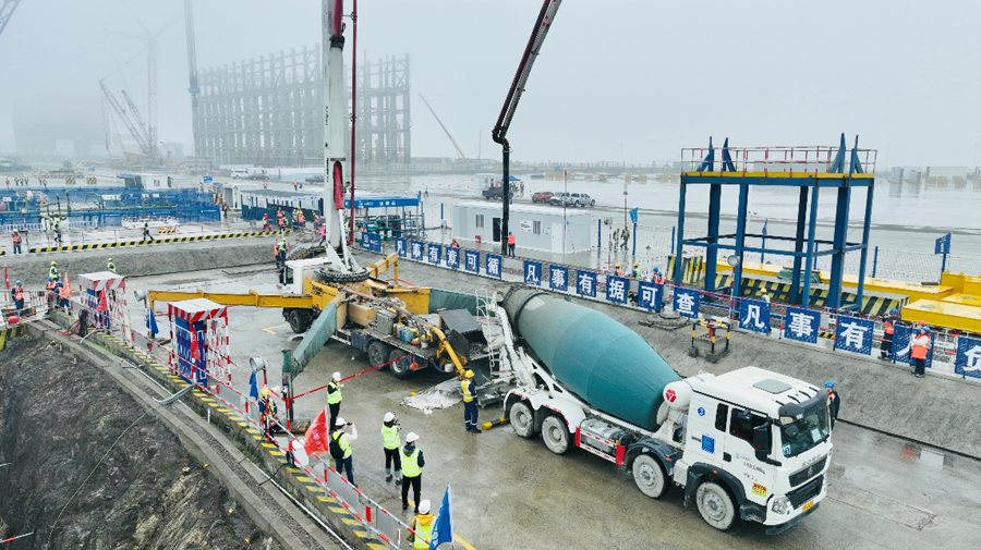 The first slab of concrete is poured for the nuclear island of the No. 4 unit of Sanmen nuclear power plant in Taizhou city, east China's Zhejiang Province. (People's Daily Online/Li Qiaochu)