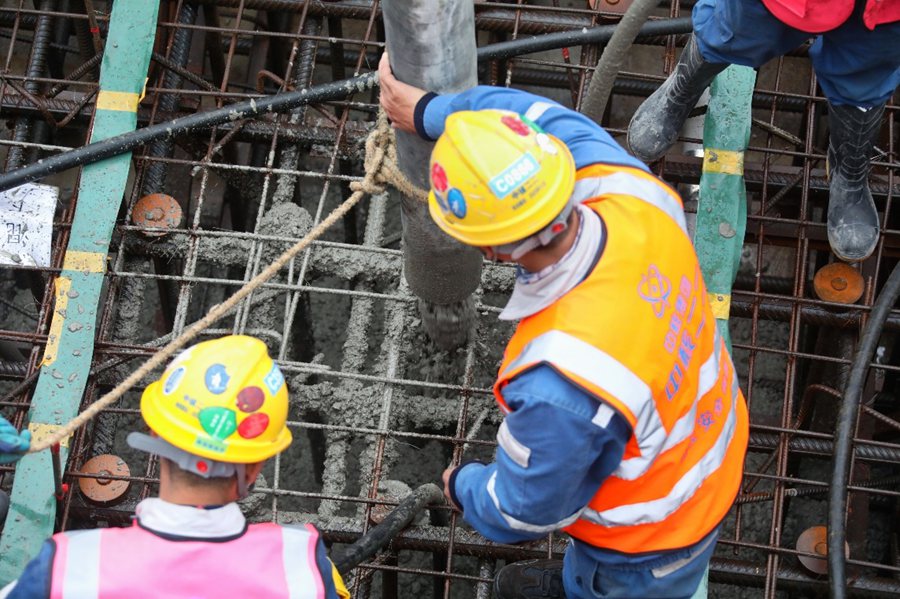 Workers prepare to pour concrete for the nuclear island of the No. 4 unit of Sanmen nuclear power plant in Taizhou city, east China's Zhejiang Province. (Photo courtesy of Sanmen Nuclear Power Co., Ltd.)?