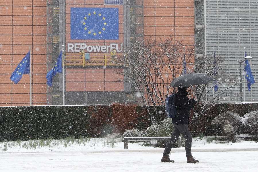 A pedestrian walks past the European Commission headquarters amid snow in Brussels, Belgium, March 8, 2023. (Xinhua/Zheng Huansong)