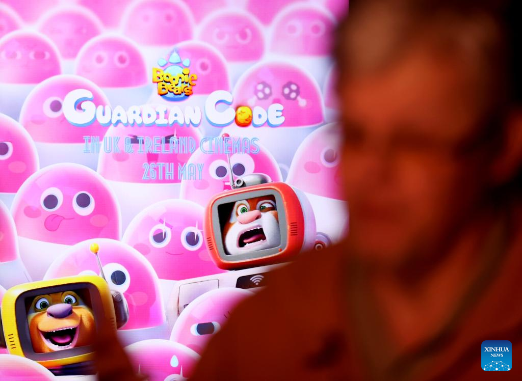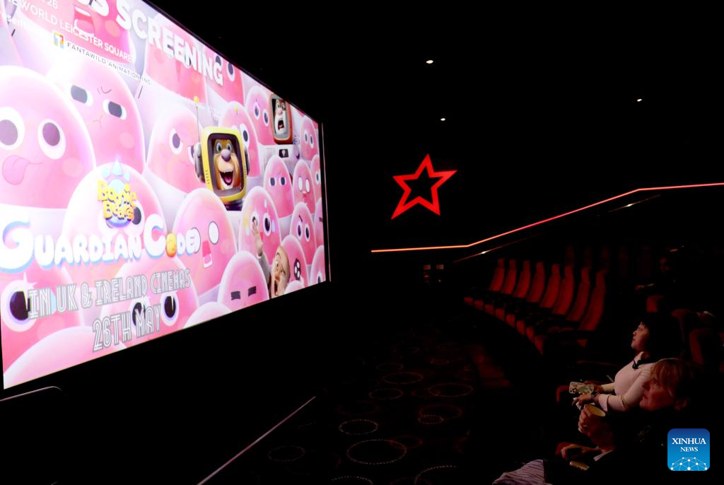 People attend a press screening of the movie "Guardian Code" in London, Britain, on April 26, 2023. A Chinese animated family movie will be on screens in over 300 cinemas across the United Kingdom (UK) and Ireland on May 26. The English-dubbed movie "Guardian Code" is an installment of "Boonie Bears," which is an animated movie series widely recognized by children in China. (Xinhua/Li Ying)
