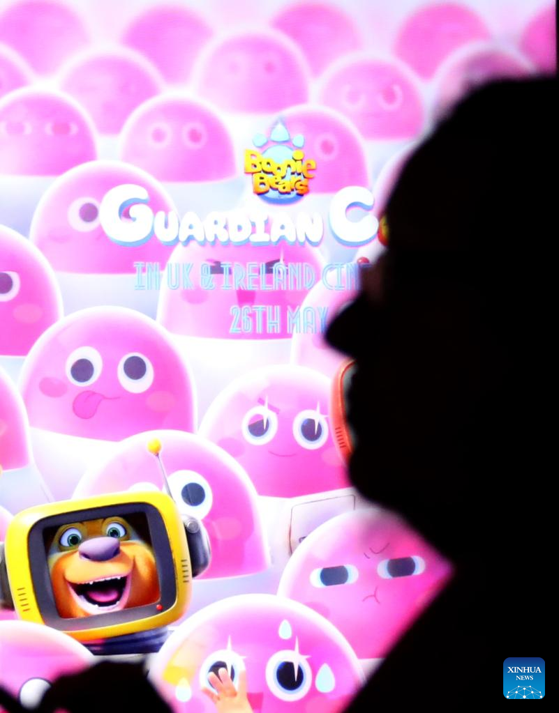 A woman is silhouetted against an electronic poster prior to a press screening of the movie "Guardian Code" in London, Britain, on April 26, 2023. A Chinese animated family movie will be on screens in over 300 cinemas across the United Kingdom (UK) and Ireland on May 26. The English-dubbed movie "Guardian Code" is an installment of "Boonie Bears," which is an animated movie series widely recognized by children in China. (Xinhua/Li Ying)