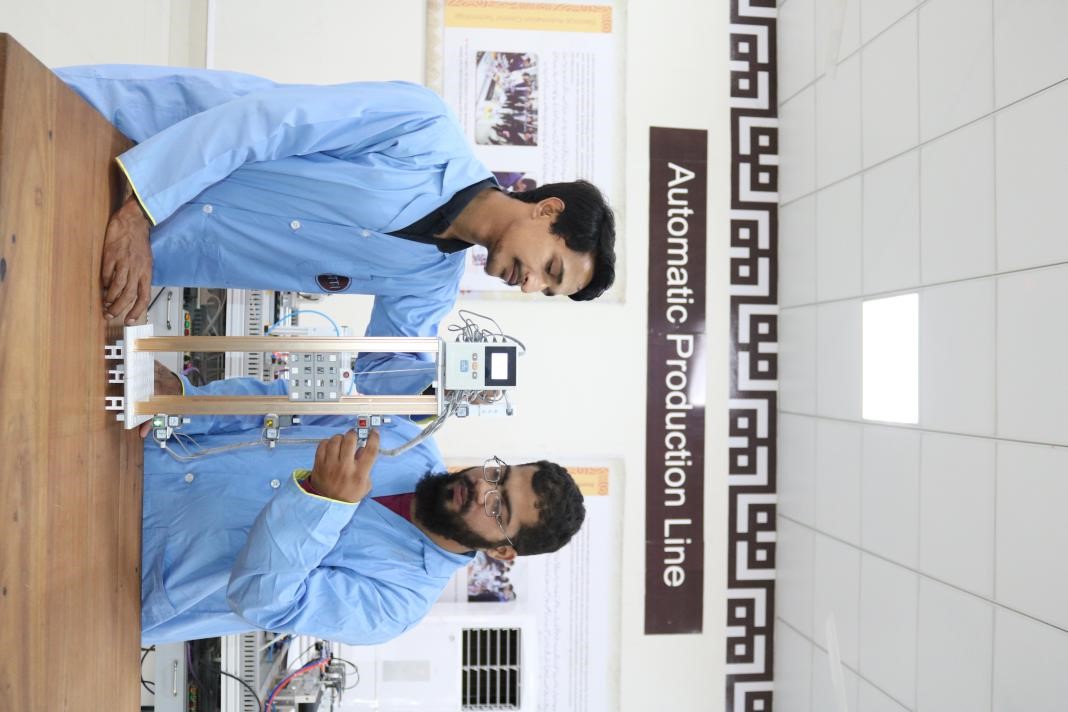 Students learn elevator operation on a class of automation and robotics of a Luban Workshop in Pakistan. (Photo courtesy of the Pakistan Luban Workshop)