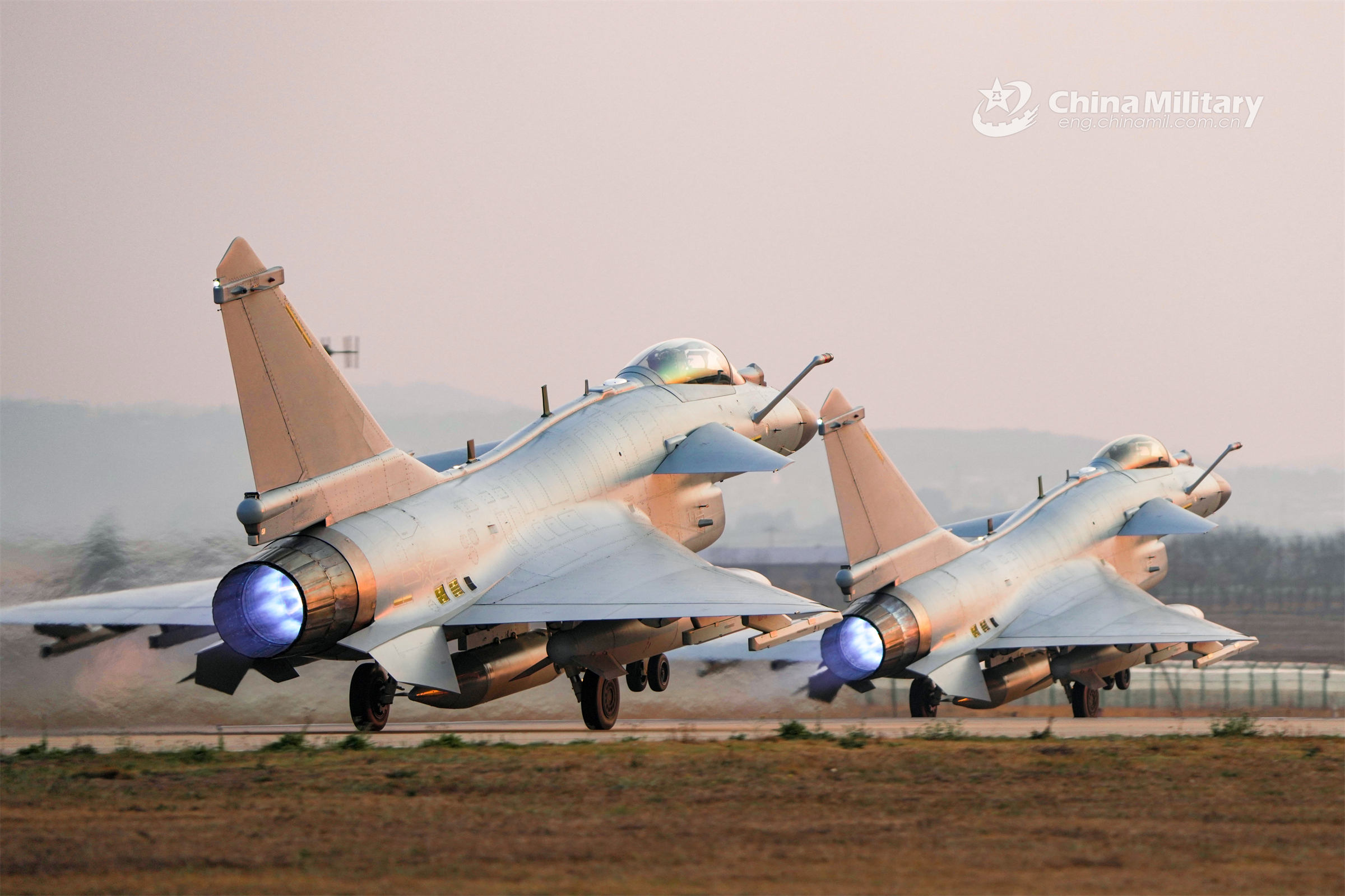 Two fighter jets attached to an aviation brigade of the air force under the PLA Southern Theater Command take off in formation during a recent round-the-clock flight training exercise. (eng.chinamil.com.cn/Photo by Wang Guoyun)