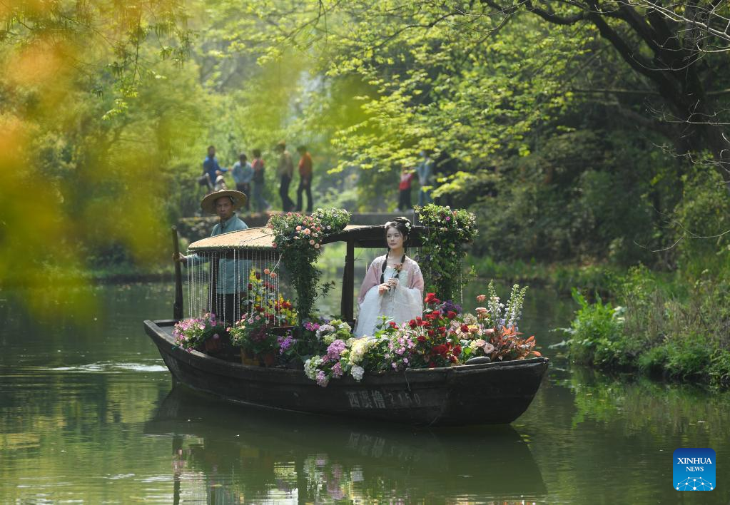 A young woman in traditional Chinese clothing Hanfu tours on a boat in Xixi Wetland in Hangzhou, capital of east China's Zhejiang Province, April 2, 2023. (Xinhua/Weng Xinyang)