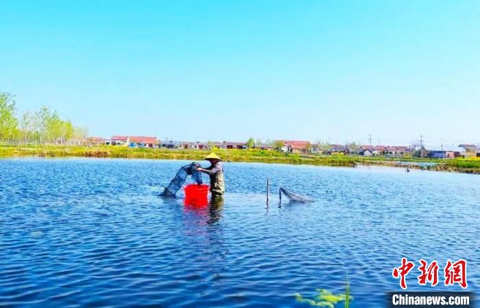 Photo shows a farmer working in a crayfish pond. (Photo/Gu Shigang)