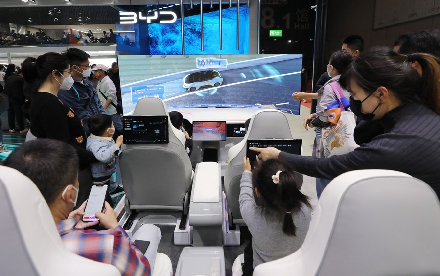 Visitors try a simulator of an intelligent sensing system at the exhibition area of Chinese carmaker BYD during the 20th Shanghai International Automobile Industry Exhibition in Shanghai, east China, April 24, 2023. (Xinhua/Fang Zhe)
