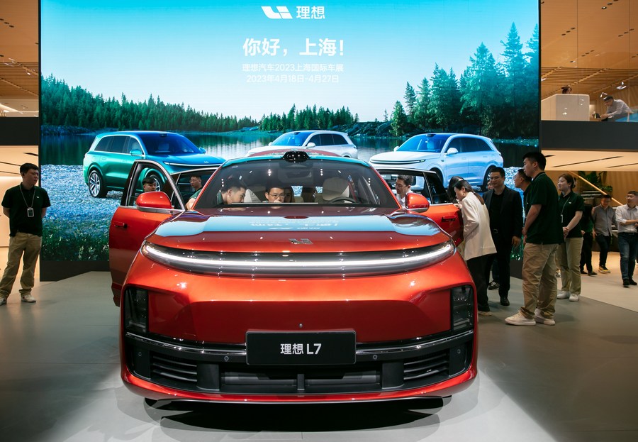 This photo taken on April 18, 2023 shows a Li Auto L7 on display during the 20th Shanghai International Automobile Industry Exhibition in Shanghai, east China. (Xinhua/Wang Xiang)