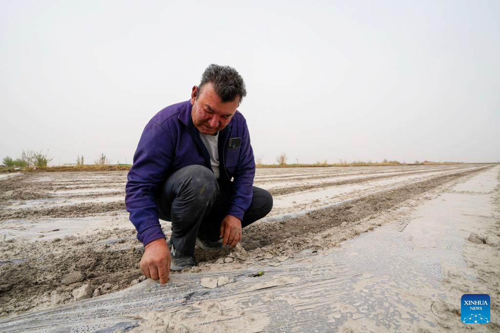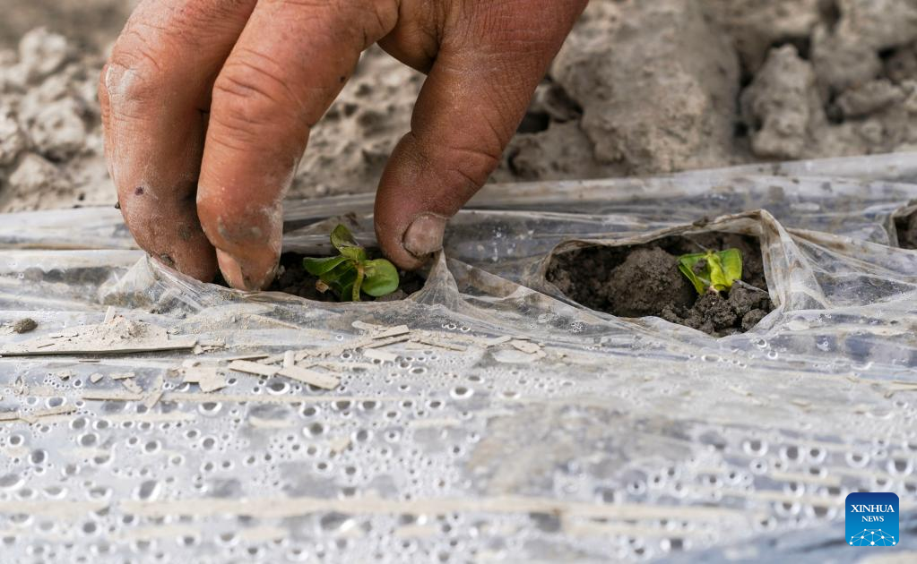 Arkin Reyim pushes the mulching film aside to let the cotton shoot come out at a cotton field in the Bax Mali Village of Yuli County, northwest China's Xinjiang Uygur Autonomous Region, April 22, 2023. (Xinhua/Zhao Ge)
