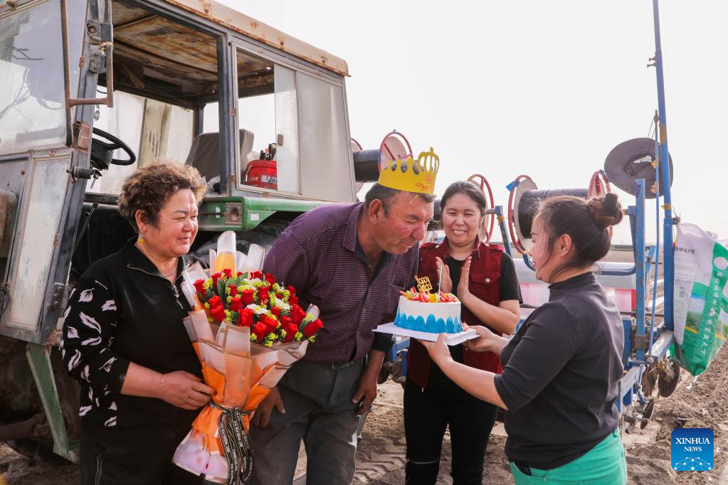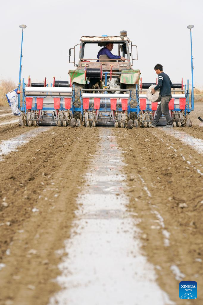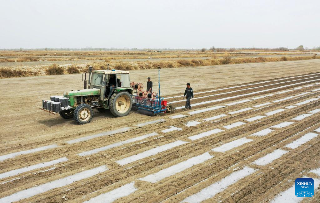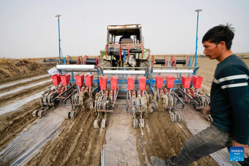 Arkin Reyim drives a tractor to lay mulching film and sow at a cotton field in the Bax Mali Village of Yuli County, northwest China's Xinjiang Uygur Autonomous Region, April 21, 2023. (Xinhua/Zhao Ge)