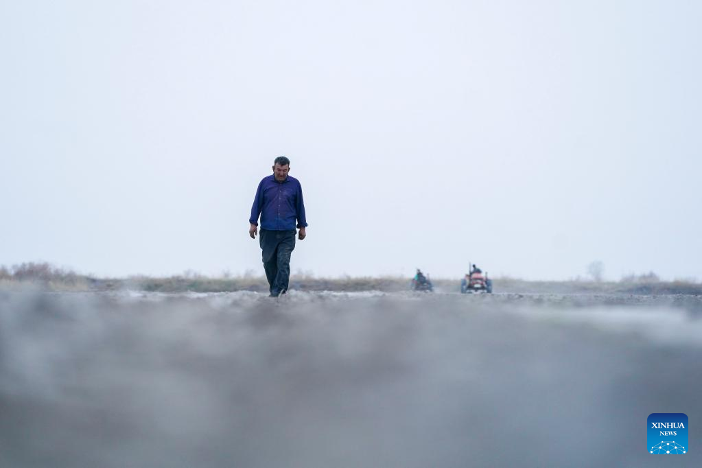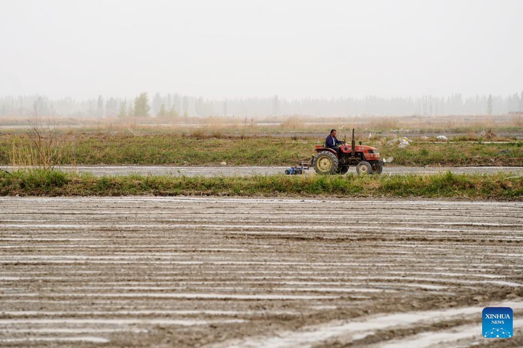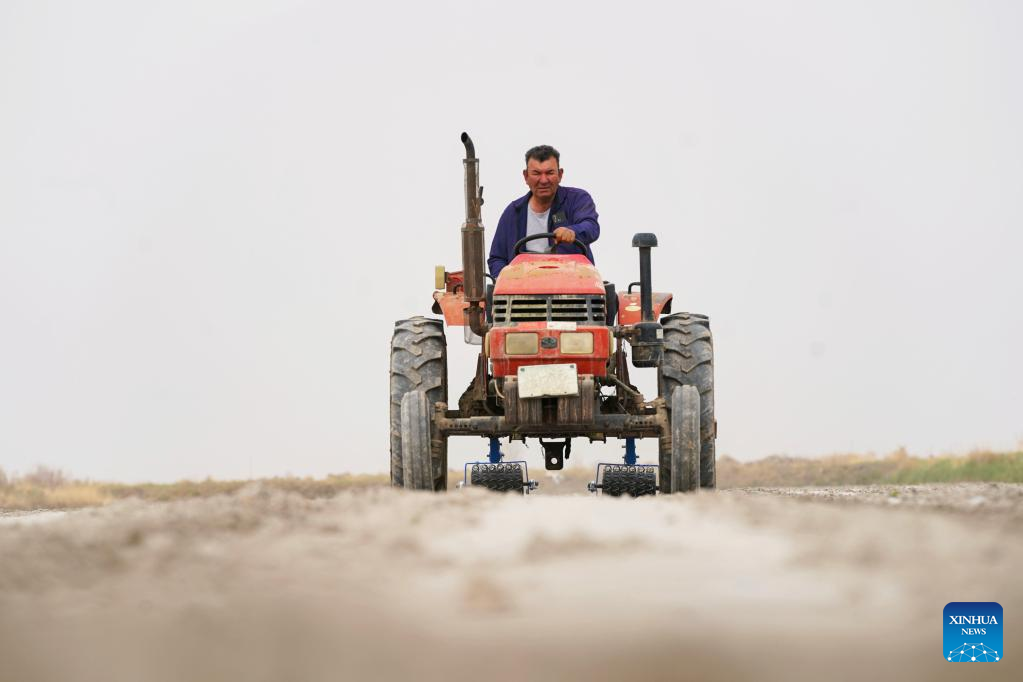 Arkin Reyim operates a scarifier to loosen the soil at a cotton field in the Bax Mali Village of Yuli County, northwest China's Xinjiang Uygur Autonomous Region, April 21, 2023. (Xinhua/Zhao Ge)