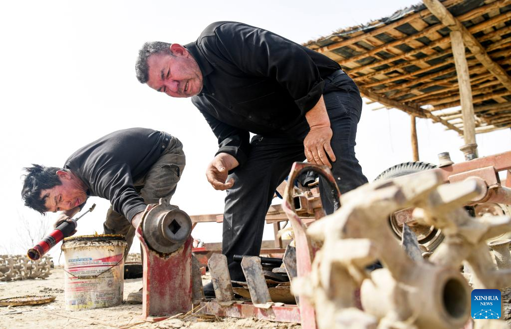 Arkin Reyim (R) inspects tools in the Bax Mali Village of Yuli County, northwest China's Xinjiang Uygur Autonomous Region, March 29, 2023. (Xinhua/Wang Fei)