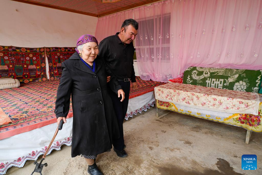 Arkin Reyim takes his mother to go for a meal in the Bax Mali Village of Yuli County, northwest China's Xinjiang Uygur Autonomous Region, April 22, 2023. (Xinhua/Zhao Ge)