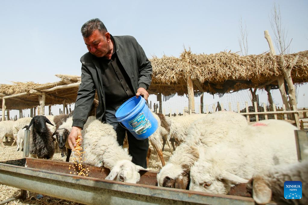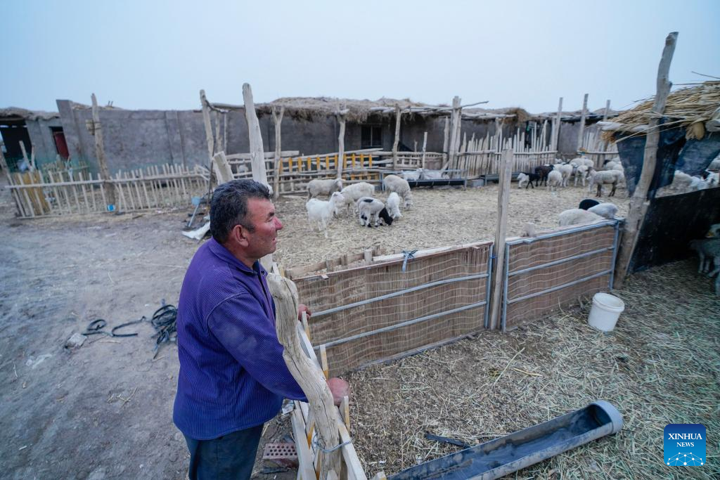 Arkin Reyim cares for his sheep after completing his farm work in the Bax Mali Village of Yuli County, northwest China's Xinjiang Uygur Autonomous Region, April 21, 2023. (Xinhua/Zhao Ge)