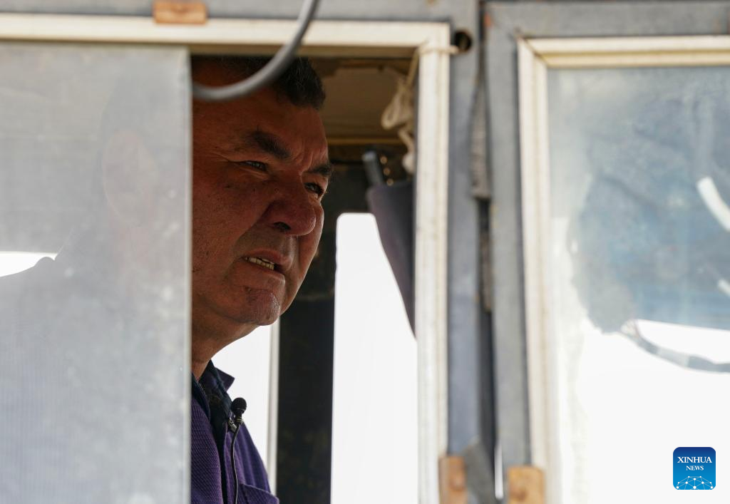 Arkin Reyim drives a tractor to work at a cotton field in the Bax Mali Village of Yuli County, northwest China's Xinjiang Uygur Autonomous Region, April 22, 2023. (Xinhua/Zhao Ge)