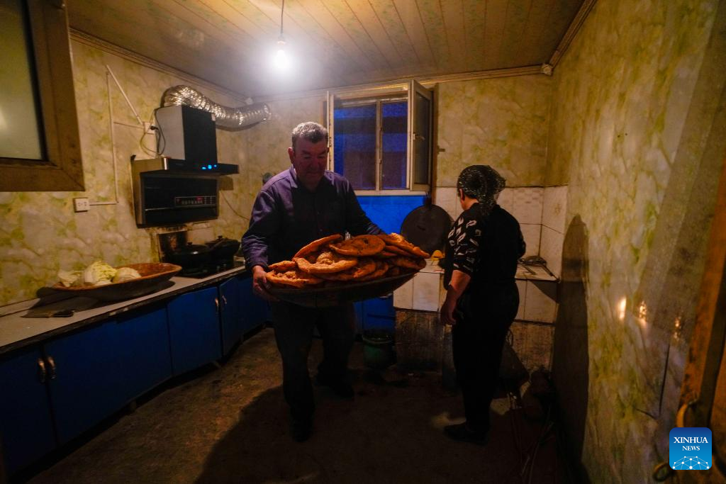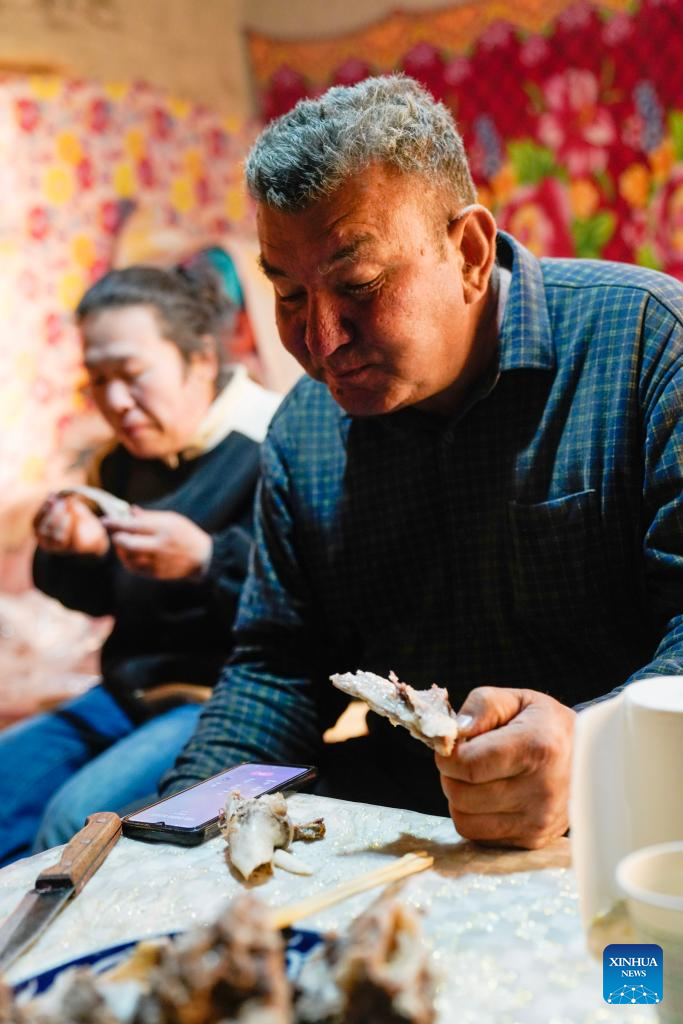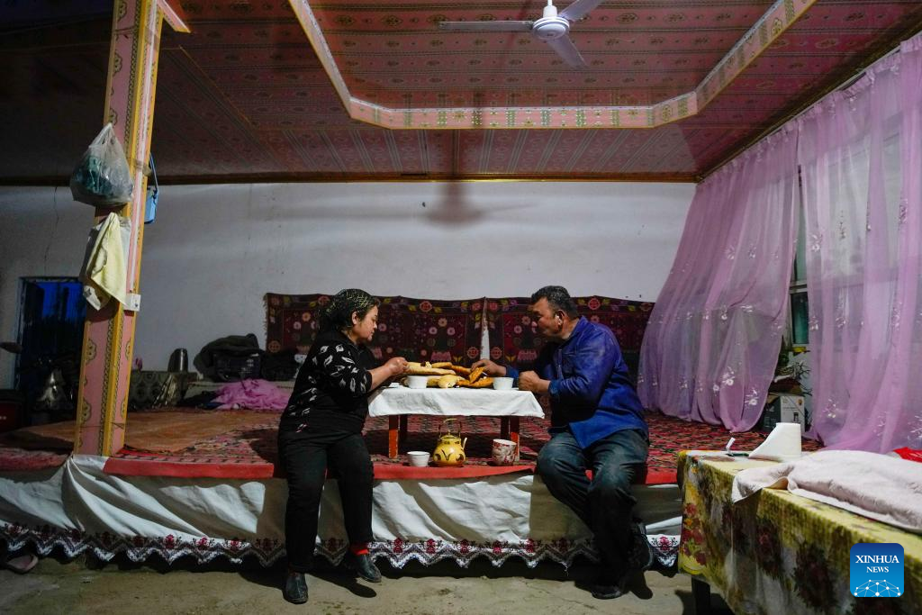 Arkin Reyim has dinner with his wife in the Bax Mali Village of Yuli County, northwest China's Xinjiang Uygur Autonomous Region, April 21, 2023. (Xinhua/Zhao Ge)