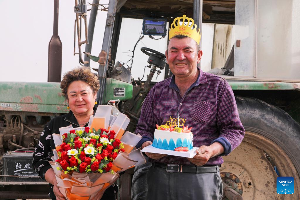 Arkin Reyim (R) holding a birthday cake poses with his wife to celebrate his 51st birthday in the Bax Mali Village of Yuli County, northwest China's Xinjiang Uygur Autonomous Region, April 17, 2023. (Photo by Wang Zhipeng/Xinhua)