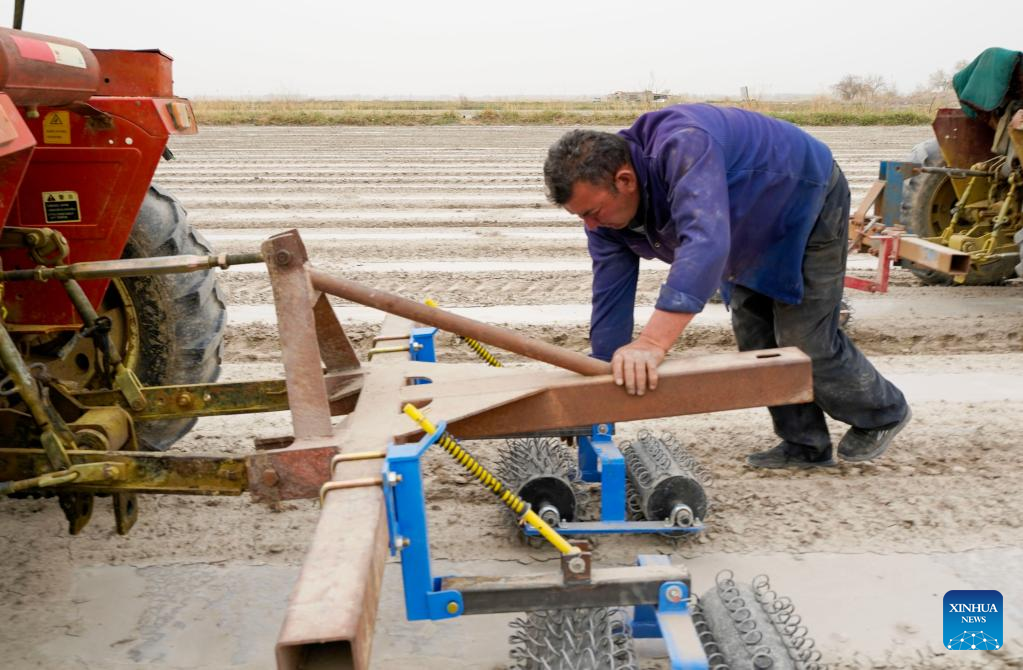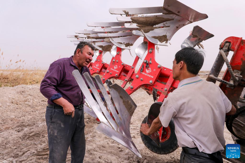 Arkin Reyim (L) inspects tools for ploughing at a cotton field in the Bax Mali Village of Yuli County, northwest China's Xinjiang Uygur Autonomous Region, April 17, 2023. (Photo by Wang Zhipeng/Xinhua)