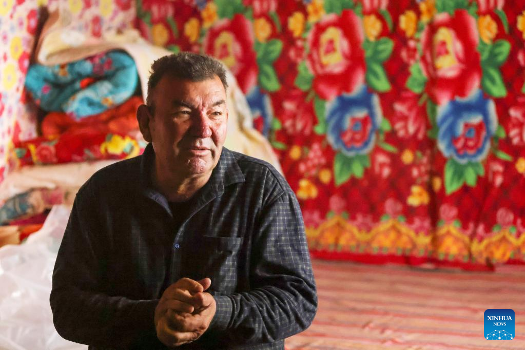 Arkin Reyim talks with his family members in Yuli County, northwest China's Xinjiang Uygur Autonomous Region, April 1, 2023. (Xinhua/Hao Zhao)